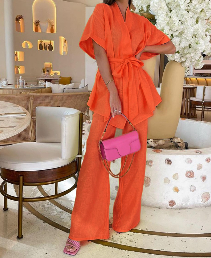 Das Damen Sommer Set aus Leinen vereint modische Raffinesse mit luftiger Leichtigkeit. Es ist die perfekte Wahl für sonnige Tage und sommerliche Anlässe, die Stil und Komfort erfordern.