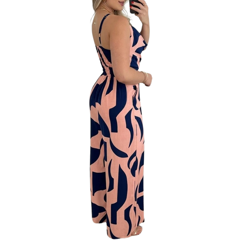 Mit seinem schmeichelhaften V-Ausschnitt und den luftigen weiten Beinen ist dieser ärmellose Jumpsuit perfekt für alles, vom informellen Brunch bis zum Ausgehen am Abend. Der einzigartige Modedruck setzt einen verspielten und doch raffinierten Akzent, während der offene Rücken Ihrem Look eine luftige Note verleiht.